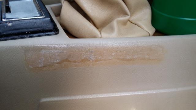 An der Mittelkonsole befindet sich auf der Beifahrerseite ein Streifen mit altem Kleberest von einem Klettverschluß-Klebeband. Das Band bröselte mehr oder weniger weg, der Kleber ist aber noch dran.