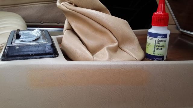 Neulich war ich bei einem Sattler und habe ihn bei der Gelegenheit um Rat zu dem Fleck auf der Mitterlkonsole gefragt. Er schaut sich das an und meint: "Das ist Sekundenkleber". Ich darauf "oh je, dann kann ich das wahrscheinlich vergessen!" Er "nein, da hab ich was", verschwindet und kommt mit einem kleinen Fläschchen wieder. Dann hat er ein bisschen probiert und siehe da, das Zeug hat sich etwas gelöst.